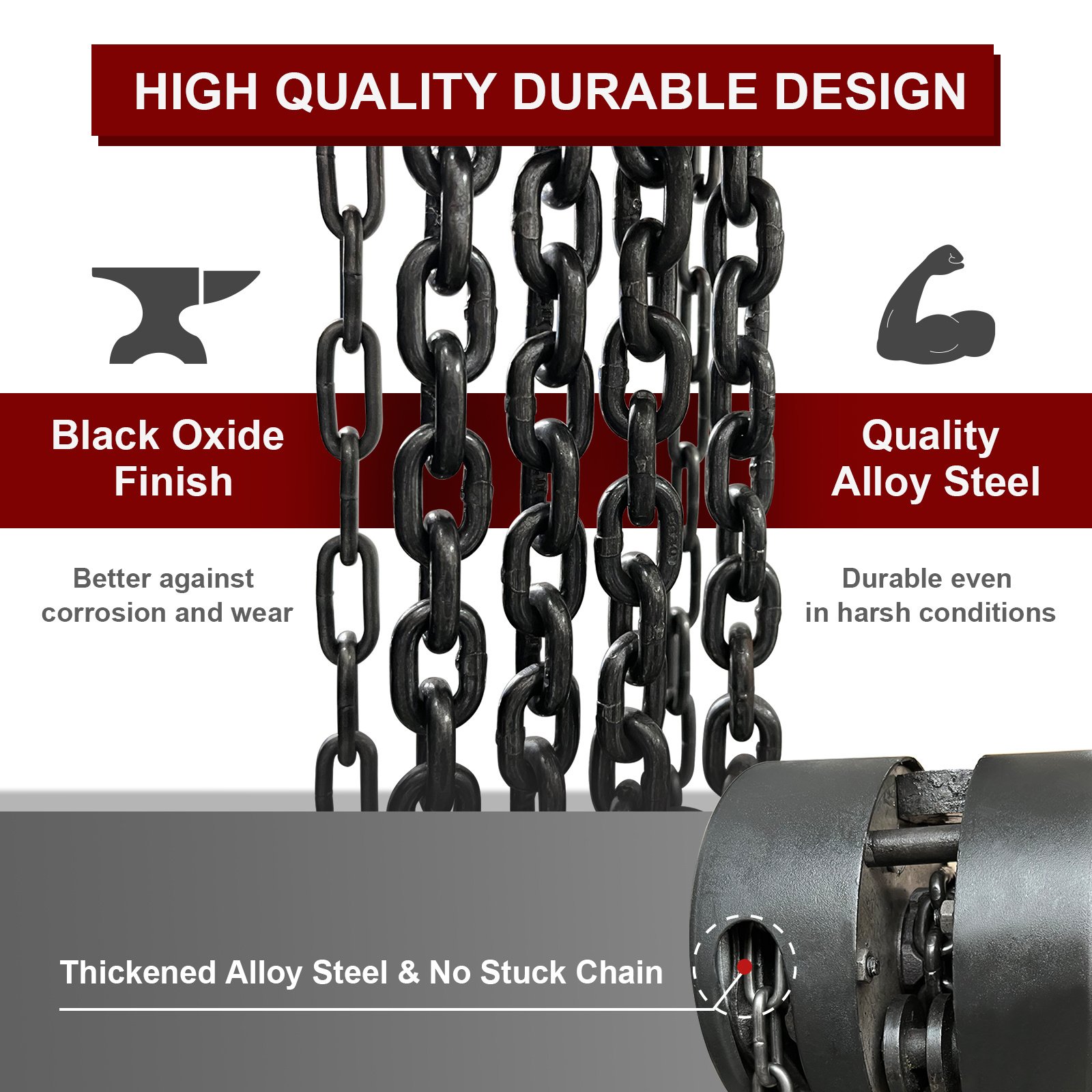 [DURABLE DESIGN]- LFGUD compact chain pulley hoist is made of high-quality alloy steel. Heavy-duty chain is forge-heated and combined with steel gear milling to strengthen durability. Cold-rolled steel cover keeps the inner parts and gear system from wear, and helps you get rid of the stuck chain. Chains are made of G80 manganese steel, which is durable even in harsh conditions.