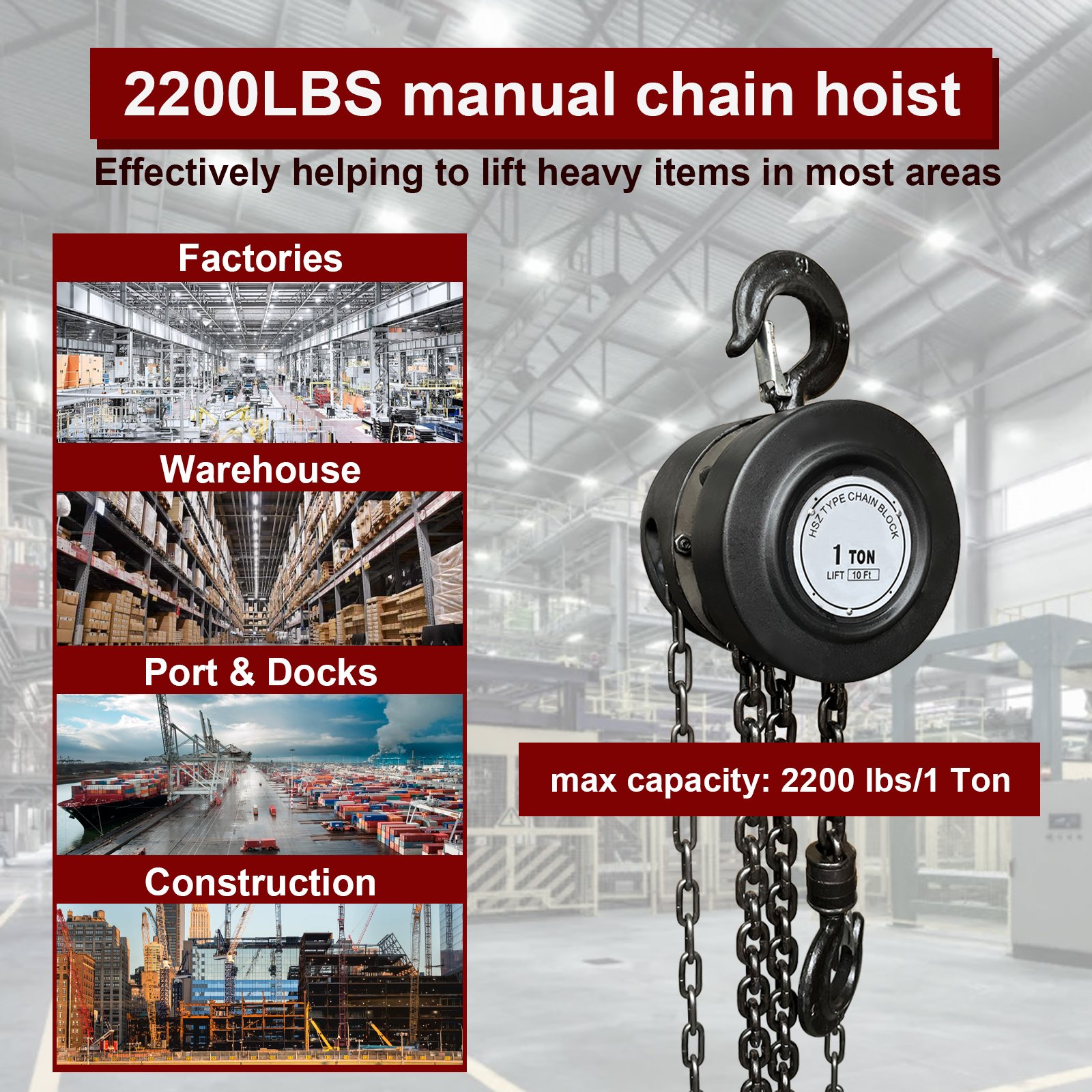 [WIDE APPLICATIONS]- This manual chain hoist can be used in most industrial areas, including factories, farms, garages, warehouses, ship-building, transport, construction sites, workshops, and mines, etc.