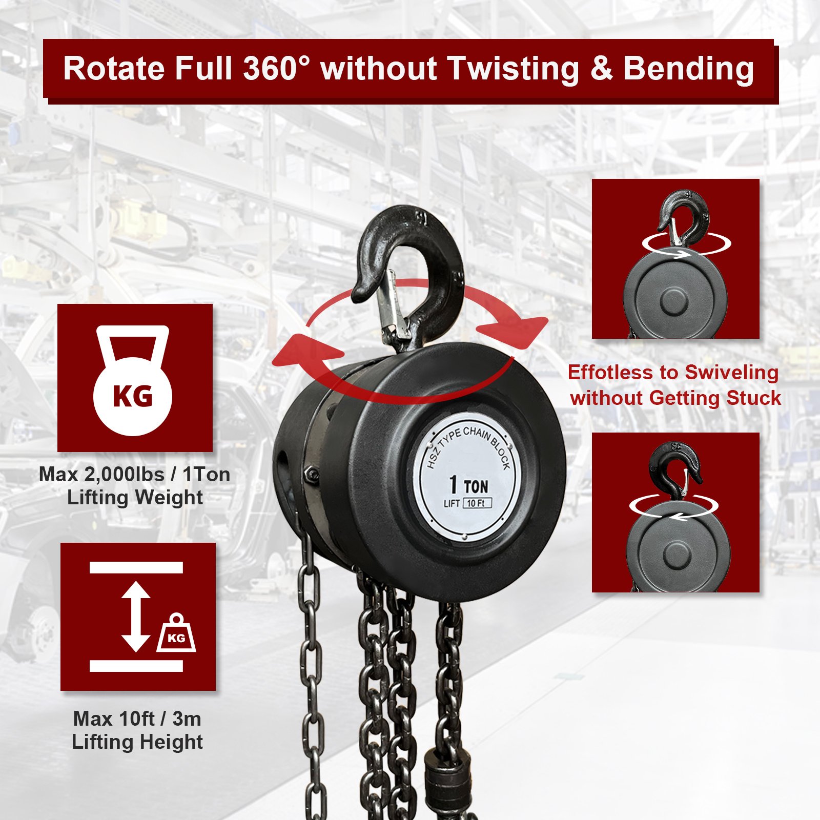 [CHAIN HOIST SPEC]- This hand chain hoist has a capacity of up to 2,000 lbs/1 Ton, and a max capacity of 2,756 lbs/1.25 Tons. Chain lift and fall height is 10 ft/3 m, which is more than enough for most industrial applications and daily use. It can lift heavy items in different sizes.