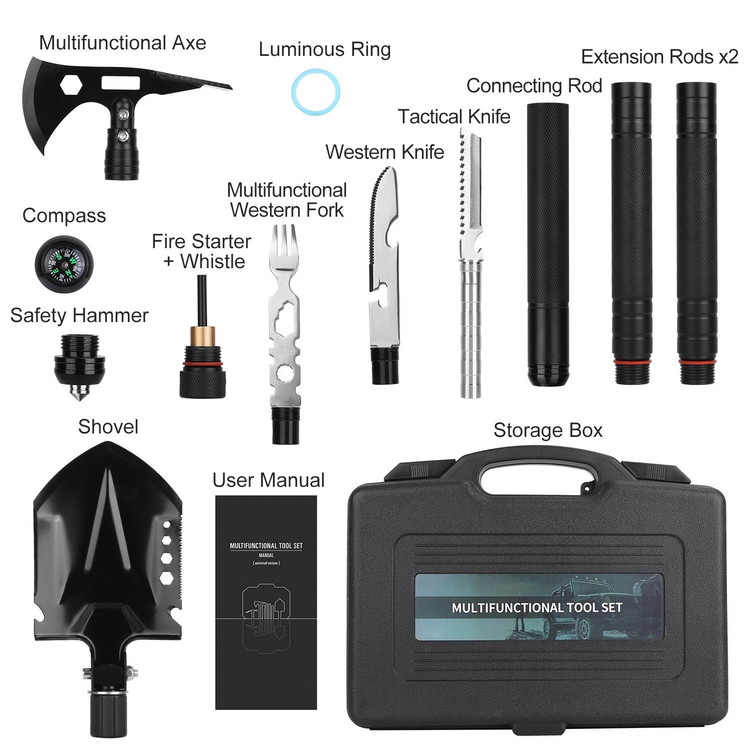 *All-In-One Multi-Tool*:Including Multifunctional Shovel,Axe,Compass,Tactical Knife,Western Knife,Western Fork,Fire Starter,Whistle,Safety Hammer,Luminous Ring,great for outdoor activities as camping,hunting,fishing,and emergencies;also works well in farm,patio,lawn,and garden.
