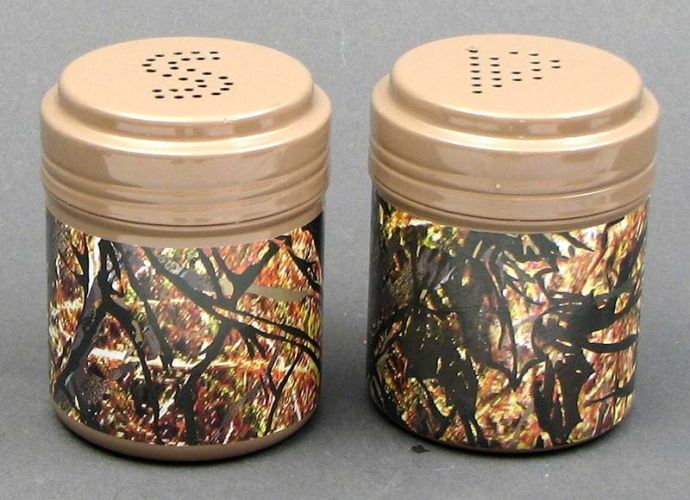 Measures: Tin camouflauge salt and pepper set. Measures: Each one is 3 3/4" Tall x 2 3/4" Wide x 2 3/4" Deep