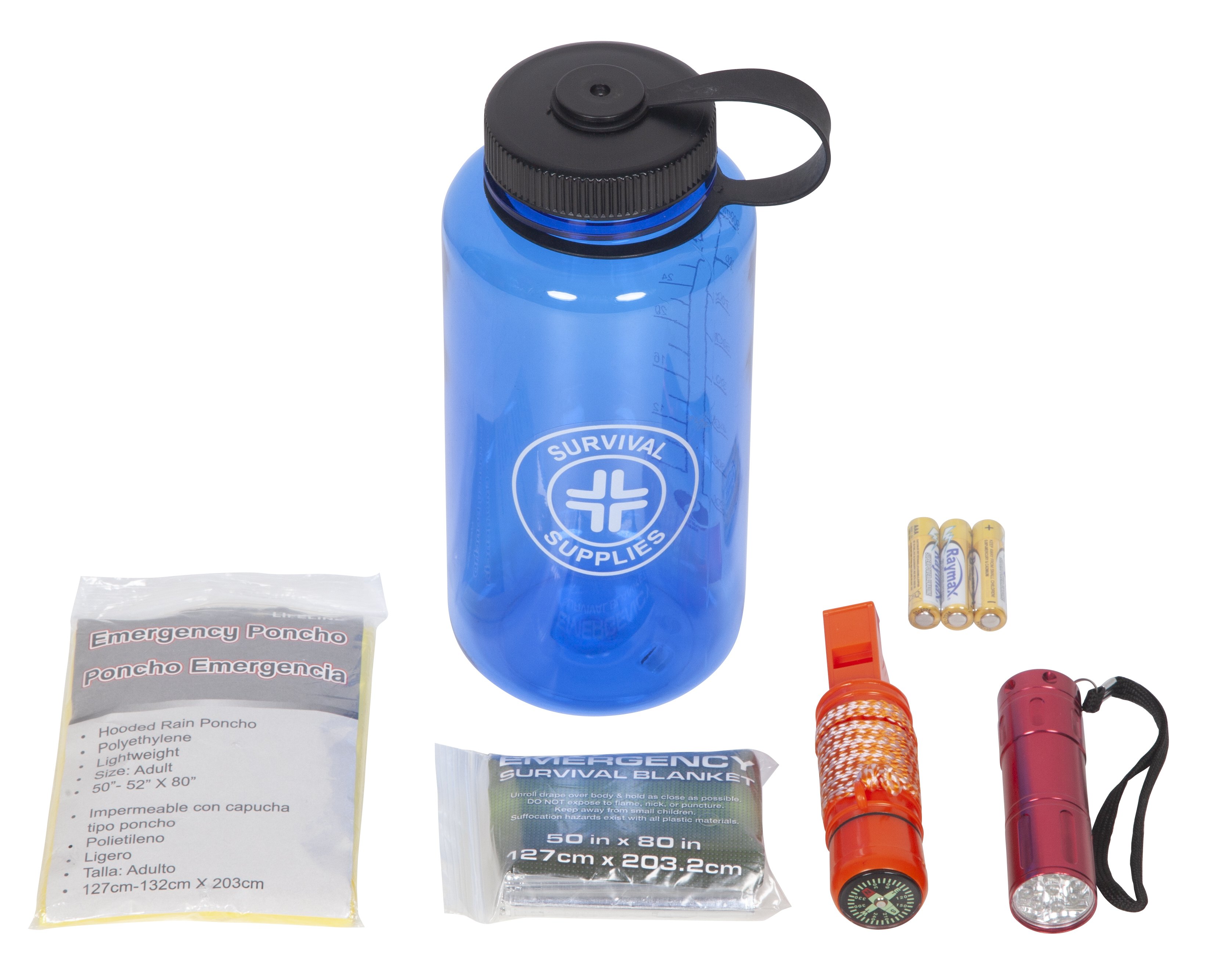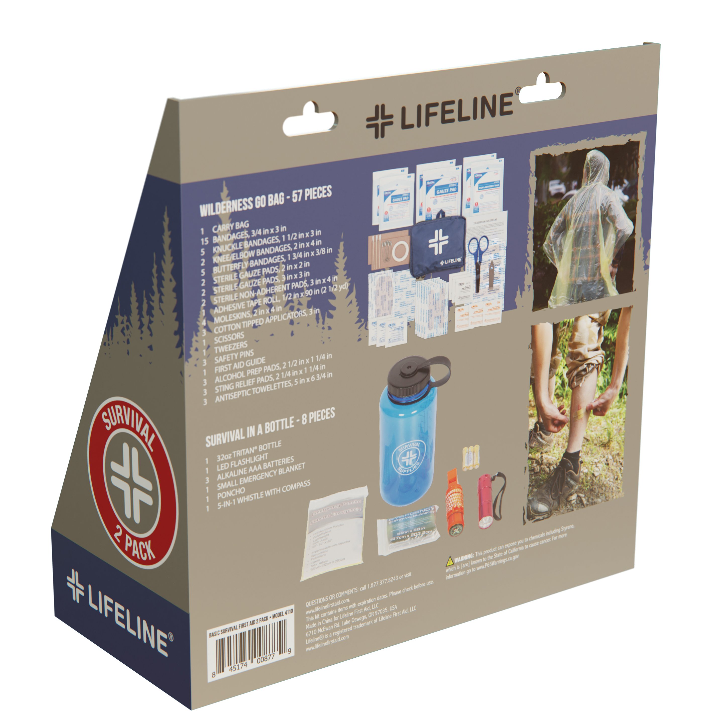 With the Lifeline Survival First Aid 2 Pack, be adequately prepared for your next adventure! Pack includes one durable 32oz Water Bottle containing multiple survival gear items such as a multi-tool, led flashlight, fishing kit, and duct tape. In addition, the pack has a first aid kit with 17 different types of first aid supplies.