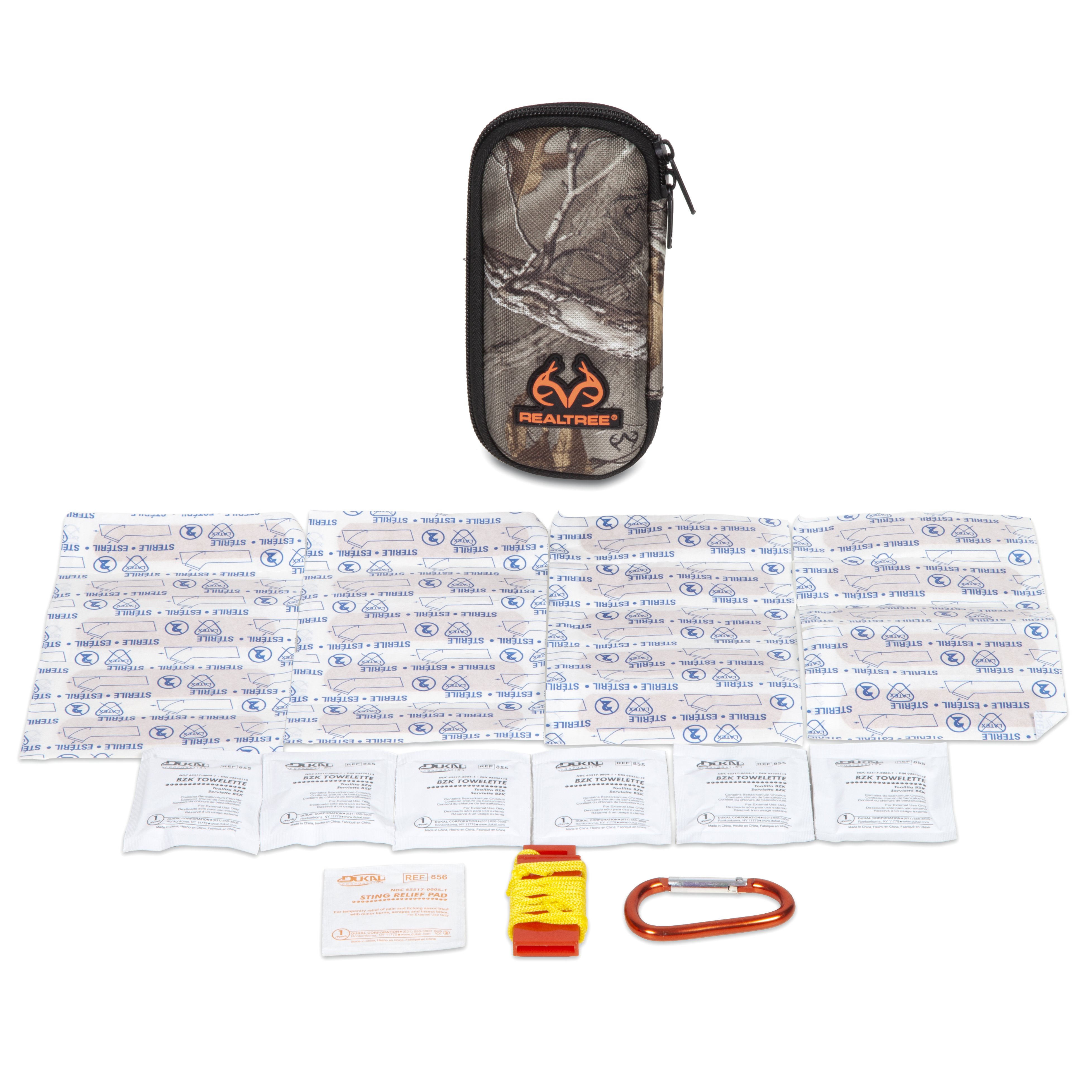 We all love to be active and we know the importance of safety when enjoying the great outdoors.  We know all adventures don’t always go the way we plan, that’s why we offer first aid kits to fit a variety of needs. The Realtree 30pc Small First Aid Kit is a great everyday kit with a variety of first aid supplies so you are prepared for any situation. This kit comes with bandages, sting relief, antiseptic towelette, and an emergency whistle so you have the basics you need to patch injuries on the go. This kit features a durable camo hard-shell foam case that can withstand being tossed around. Throw this compact first aid kit in your purse, backpack, or car glove box so you’re always prepared! Use the included small carabiner and strap system to easily attach to your backpacks, belt or MOLLE gear for access to first aid supplies on the go. The easy to pack Realtree Small Hard-Shell Foam First Aid Kit is perfect to throw into your bag, camping supplies, vehicles, or home so you’re ready for when minor cuts or scrapes happen. The Realtree 30pc Small First Aid Kit includes: Realtree Hard Shell Foam Case, ¾” x 3” Adhesive Bandages, Antiseptic Towelettes, Sting Relief Pad, Whistle, Carabiner