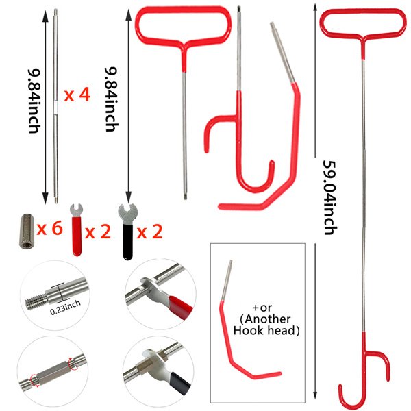 The main stainless steel 7 connectors, made of high quality solid stainless steel, strong anti-oxidation, not easy to bend. Precision thread for seamless connection between connecting rods. It consists of 6 parts -9.84in (~25cm) handle rod, 9.84in (~25cm) hook rod and 4 9.84in (~25cm) extension rod, which can reach 59.05in (~150cm) when assembled. It can be assembled into 3 sizes according to different needs. Non-slip soft rubber handle protection and groove design for easy assembly and disassembly, lengthening the rubber position of the hook head without worrying about damage to the paint.