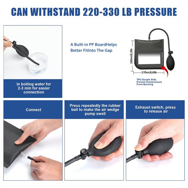 Made of high quality TPU material. Rounded corners, hard durable edges, smooth exterior, with a hard PVC sheet in the middle, easier to insert to resist greater pressure. A simple squeeze pump and precise bleed valve help you lift and lower into perfect position. Inflatable airbags are suitable for Windows, doors, cabinet installations, appliances and plumbing. Caution: Do not overinflate, so as not to damage the air bag.