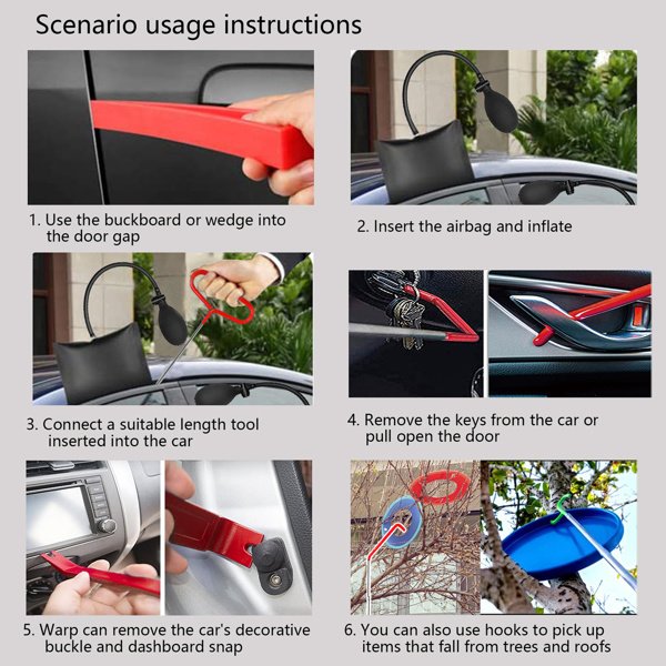 GM's emergency kit for car doors and home windows adjustment, if the key is locked back in the car or children or pets are locked back, emergency can use this kit to open the car door aid. Very effective. No damage to your vehicle. Or there are items hanging on trees, roofs, fall into the river can be used in an emergency long-distance hooking tool. Professional kits for cars and trucks, each designed to be flexible, easy to operate and get the job done in minutes. Suitable for all vehicle types. Will not cause damage or leave any scratches.
